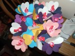 The flowers are made by cutting hearts and combining them together. You fold the hearts to give them the look of flower petals. The centers are mini tootsie pops.