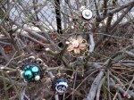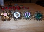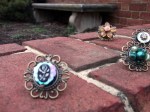 Made more rings. Played with some items I already had in my bead collection. I also found some stuff at Michaels in the vintage looking area of the bead section. Went outside and played with hanging the rings on a bush and then put some on the red brick.