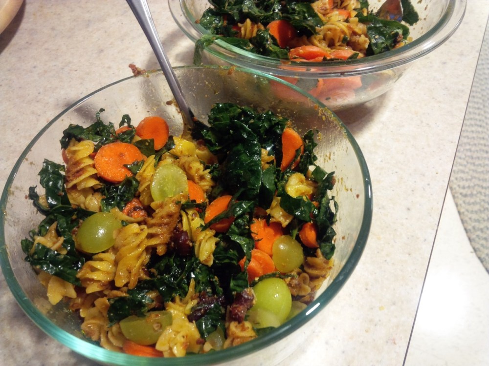 Made this for dinner for us. Kale, grapes, dates, carrots, nutritional yeast, and quinoa pasta snuggled with sun dried tomato pesto.