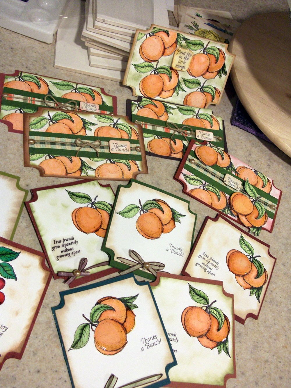 one of my fav card sets to make. I love fruit. Flourishes.org makes gorg fruit stamps. gorg stamps in general. The card bases were made by welding frames on the cricut. The white frames are daubed with distress ink. I believe it is the tea stain one. I love working with more country or rustic colors. Images colored with copics. Some of the peaches have dimensional magic on them for an added pop and well dimension. Then i just play with the accessories. Ribbon, twine, and pearls are my fav to work with on cards. All together I think 1 card takes an hour to make. The rectangle version might take a bit longer since there is more to color and shade.
