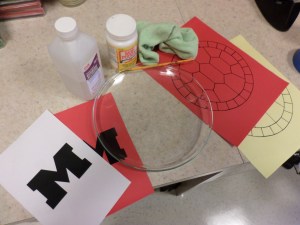 Clean your glassware. Print your template. Trace your template onto the plate. Place the picture side of template facing up towards you so you can see if through the plate. Tape the paper to your plate so you dont move and shift things by accident. Trace with marker.