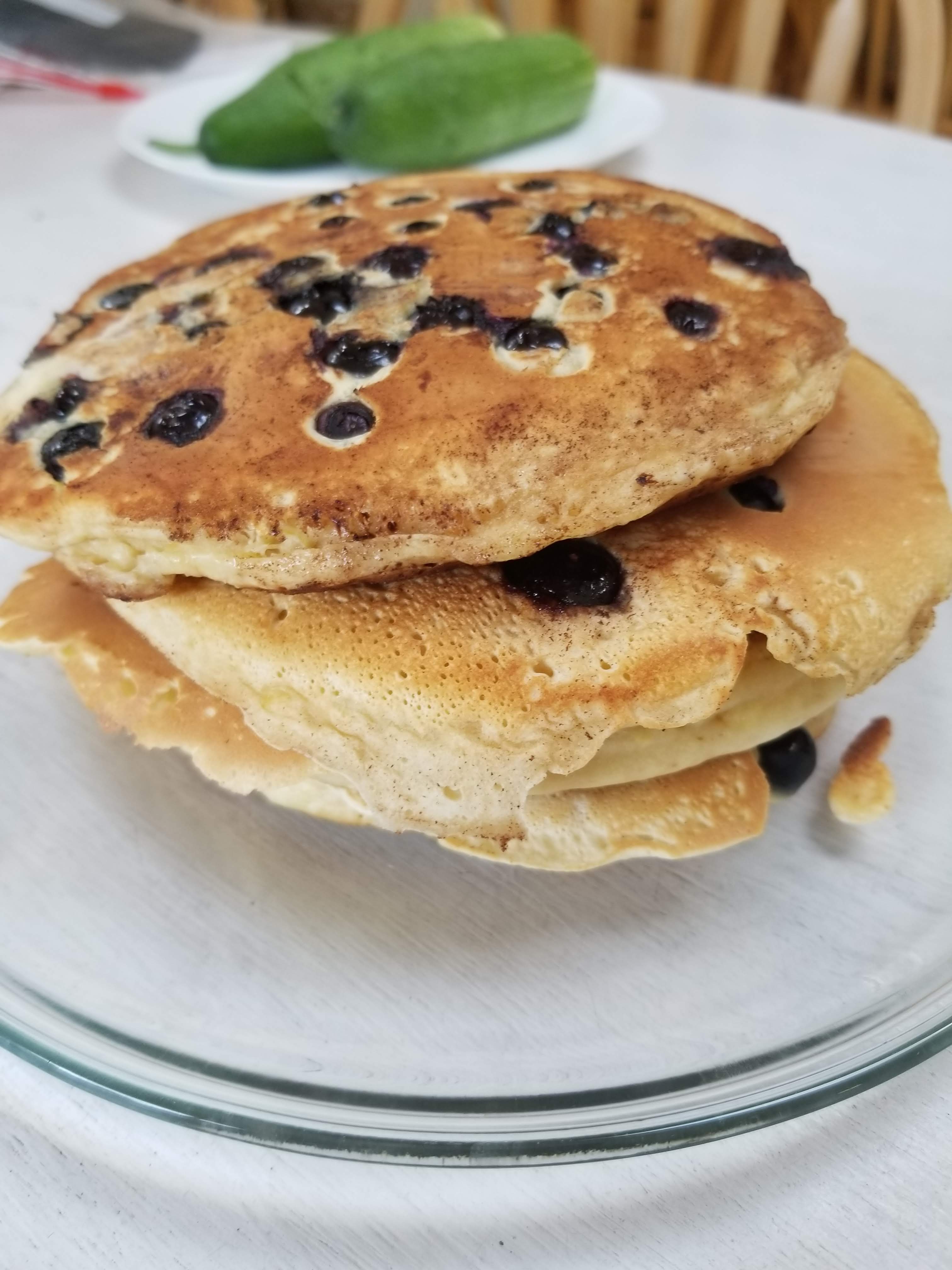 Put everything except the blueberries in a bowl. Whisk the ingredients together in the the bowl. Heat and grease your pan as you normally would for pancakes. My advice lowish and slow. I cook my pancakes at about a 3 on the dial. I grease my pan with Miyoko vegan butter.